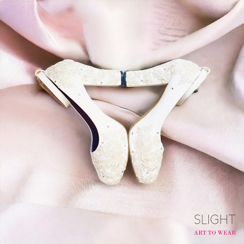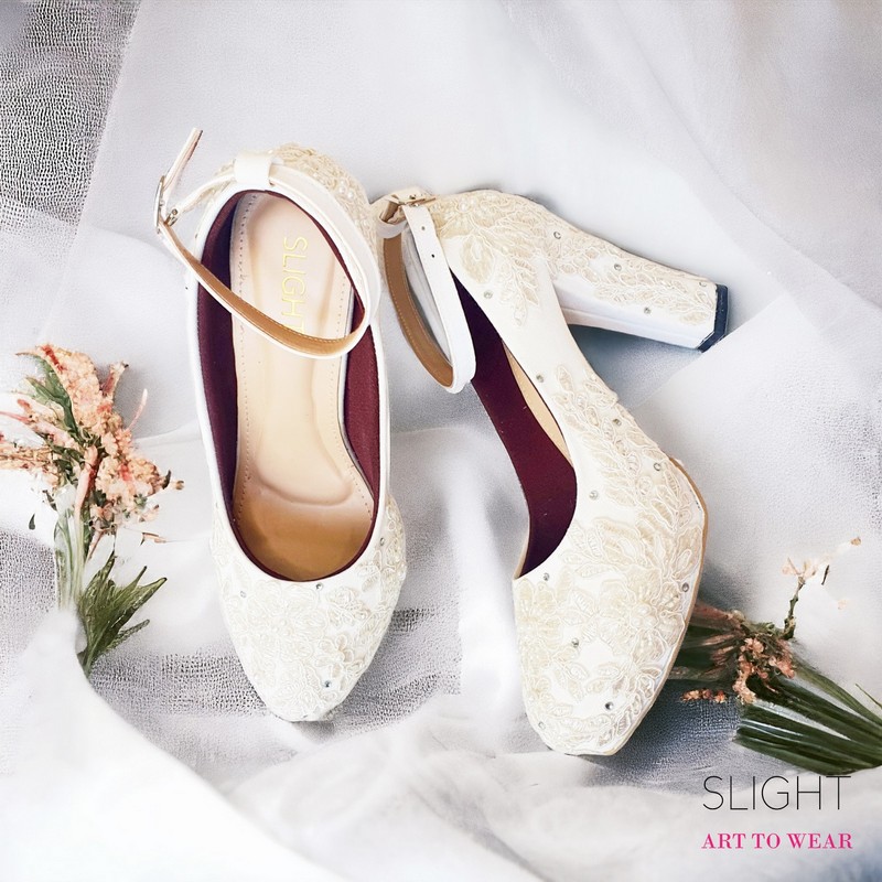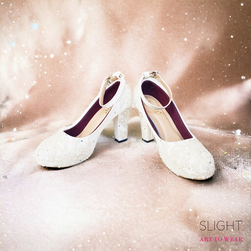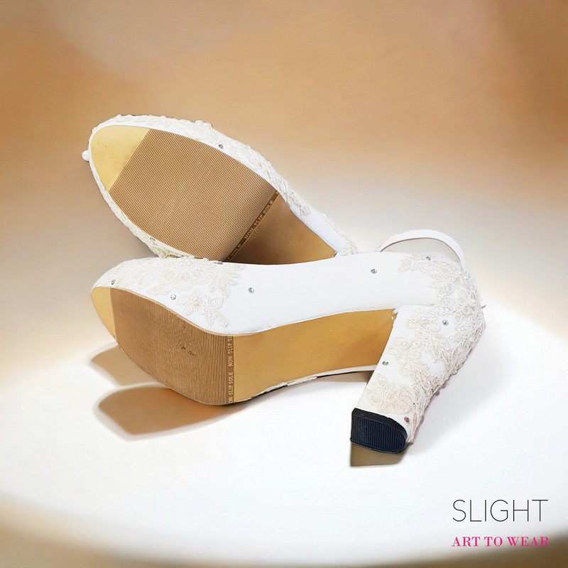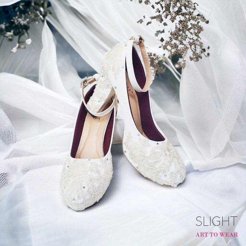 Desain sepatu ini terinspirasi dari keindahan motif brukat yang mewah dan klasik, serta manik-manik yang memukau yang tersebar di seluruh bagian. Model sepatunya elegan dan mewah, dan dibuat dengan kombinasi bahan berkualitas tinggi, seperti brukat, manik-manik, sol fiber, cat textile, serta katun jepang. Semua bahan ini disusun dengan penuh keahlian agar tampilan sepatu terlihat cantik dan memukau. Kami memilih warna putih yang lembut agar sepatu terlihat elegan.